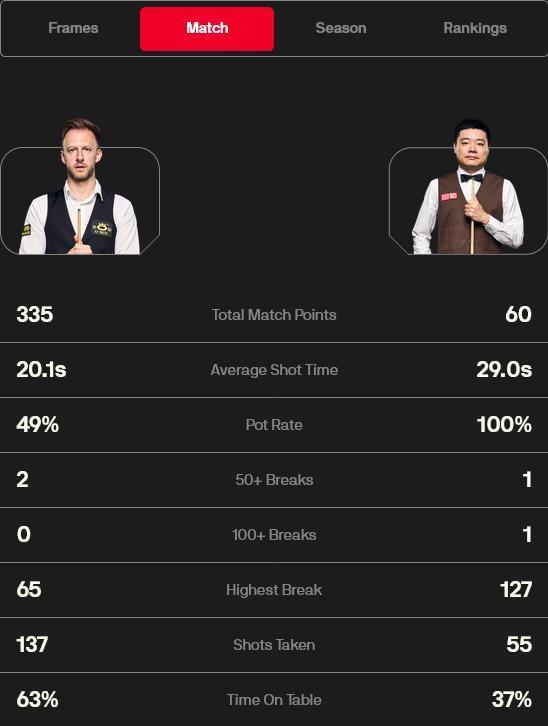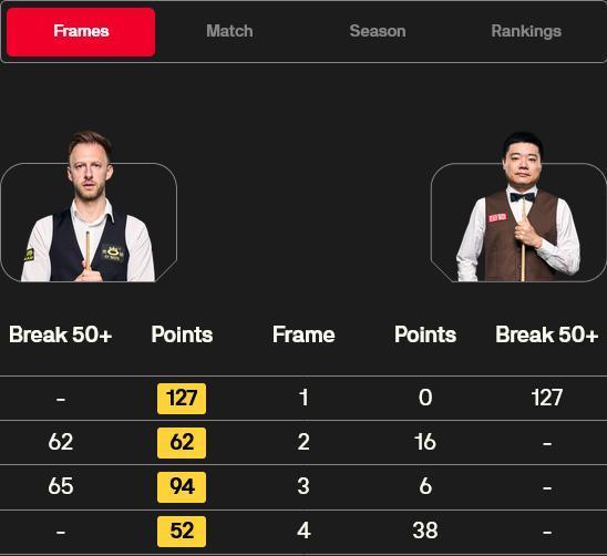 在首场小组半决赛中,2号种子贾德-特鲁姆普景况火热,开场就打出1杆破百和2杆60+,连胜3局,大比分3-0跳跃拿到赛点。丁俊晖在第四局找到一些景况,与“王牌君”伸开阻挠大战,不外关节时辰,也曾英格兰东说念主收拢契机,以52-38再胜一局,大比分4-0到手,起初晋级小组决赛。