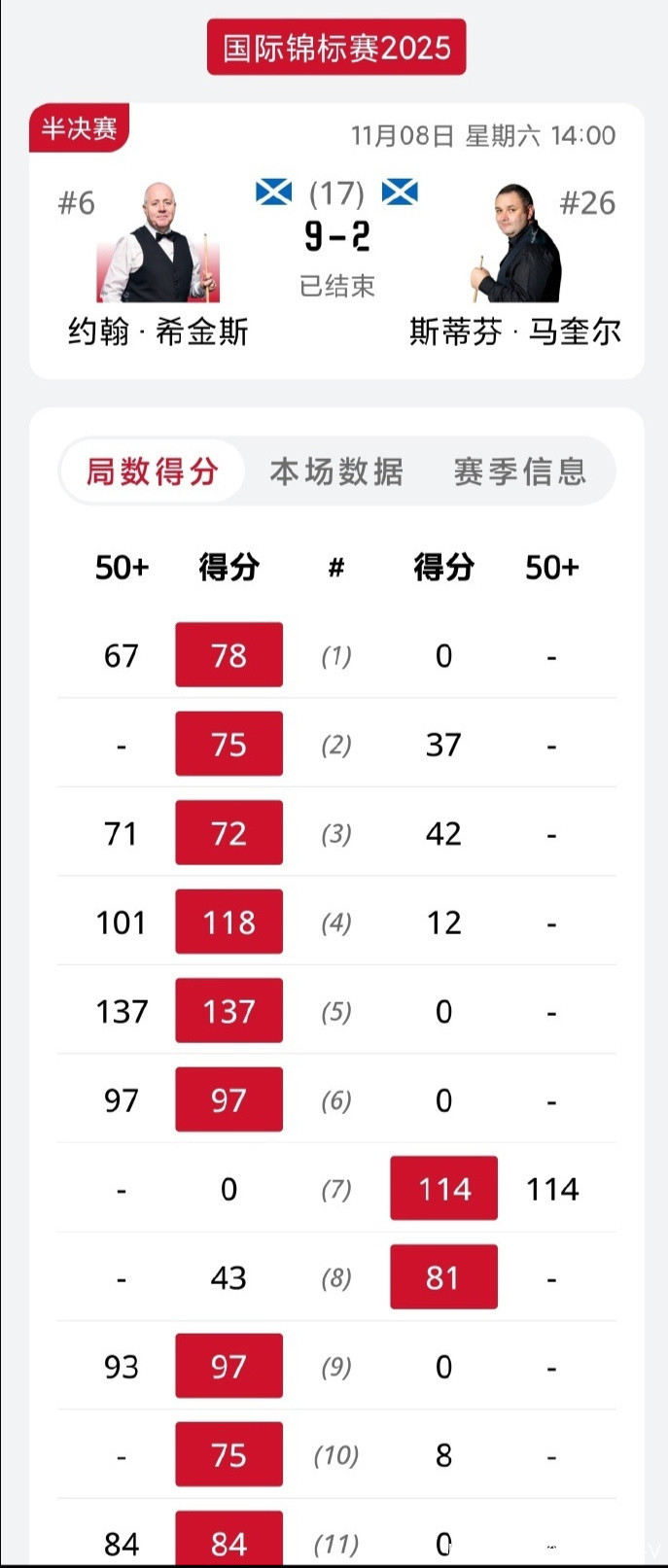 2025年斯诺克国锦赛经过浓烈争夺,两位中国选手吴宜泽、赵心童,两位苏格兰选手约翰-希金斯、斯蒂芬-马奎尔打进四强。第一场半决赛,吴宜泽以9-6驯服赵心童。