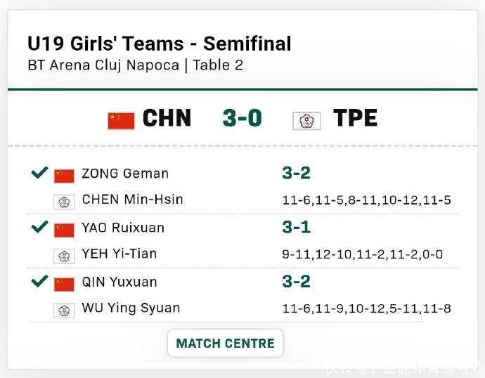 来到女团冠军战,中国U19队与日本队的比赛打得极端胶著和浓烈。纵歌曼先所以2-3输掉第一盘,覃予萱在第二盘以3-0扳平比分。而后,两边各胜一盘,比分战成2-2平局。决胜盘,纵歌曼布置压力,以3-2逆转小盐悠菜,匡助球队以3-2夺得冠军,祝福中国U18女队!