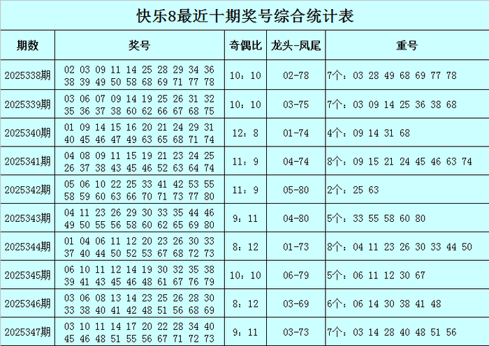 福彩风景8第2025347期开出奖号:03 10 11 14 17 20 22 28 34 40 45 46 48 51 55 56 67 71 72 73,其中奖号奇偶比为9:11,出现7个重号03、14、28、40、48、51、56,开出连码10 11、45 46、55 56、71 72 73。